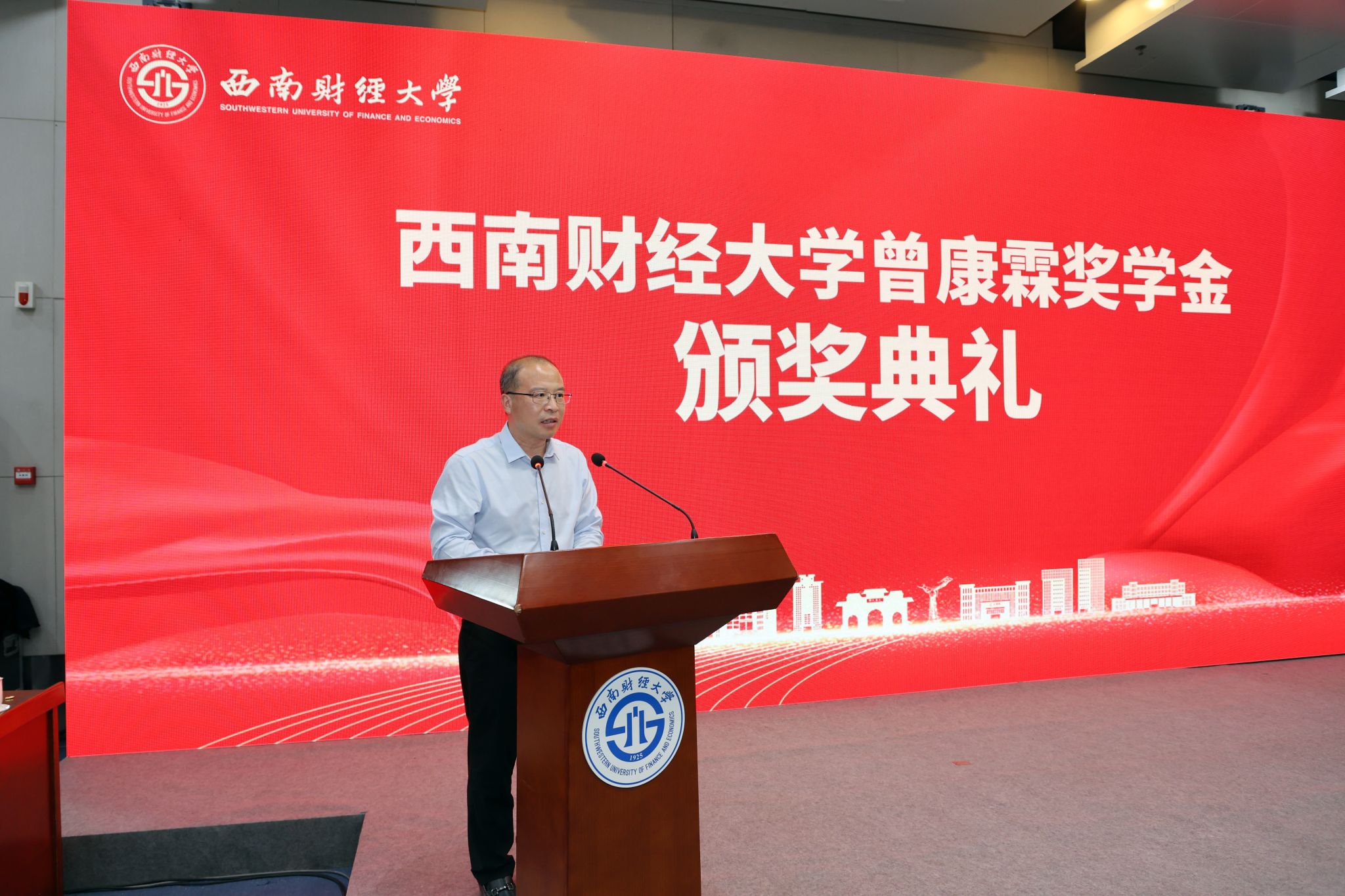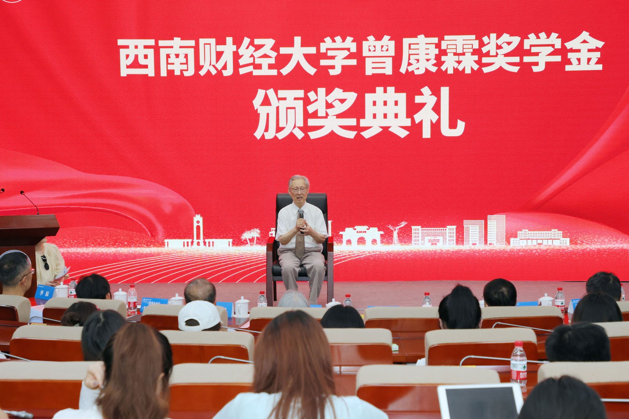 李永强在致辞中代表学校向曾康霖教授及家人表示诚挚感谢和崇高敬意。他表示,曾康霖教授数十载如一日,始终秉持对教育事业的忠诚与奉献,对金融学科的执着与追求,潜心育才、深耕学术,为我国金融学科建设与发展倾注了巨大心血,培养了一大批优秀金融人才,为国家金融事业和金融教育事业发展作出了卓著贡献。他勉励全校师生仰先生之大德,心怀大我,赤诚报国;慕先生之大学,开放包容,格致穷理;循先生之大道,知行合一,笃行不怠。他希望同学们心怀“国之大者”,弘扬西财精神,从深沉的文化自信和时代责任中汲取求知、明理、增智的不竭动力,争做有理想、敢担当、能吃苦、肯奋斗的新时代好青年,奋力书写为中国式现代化挺膺担当的青春篇章。