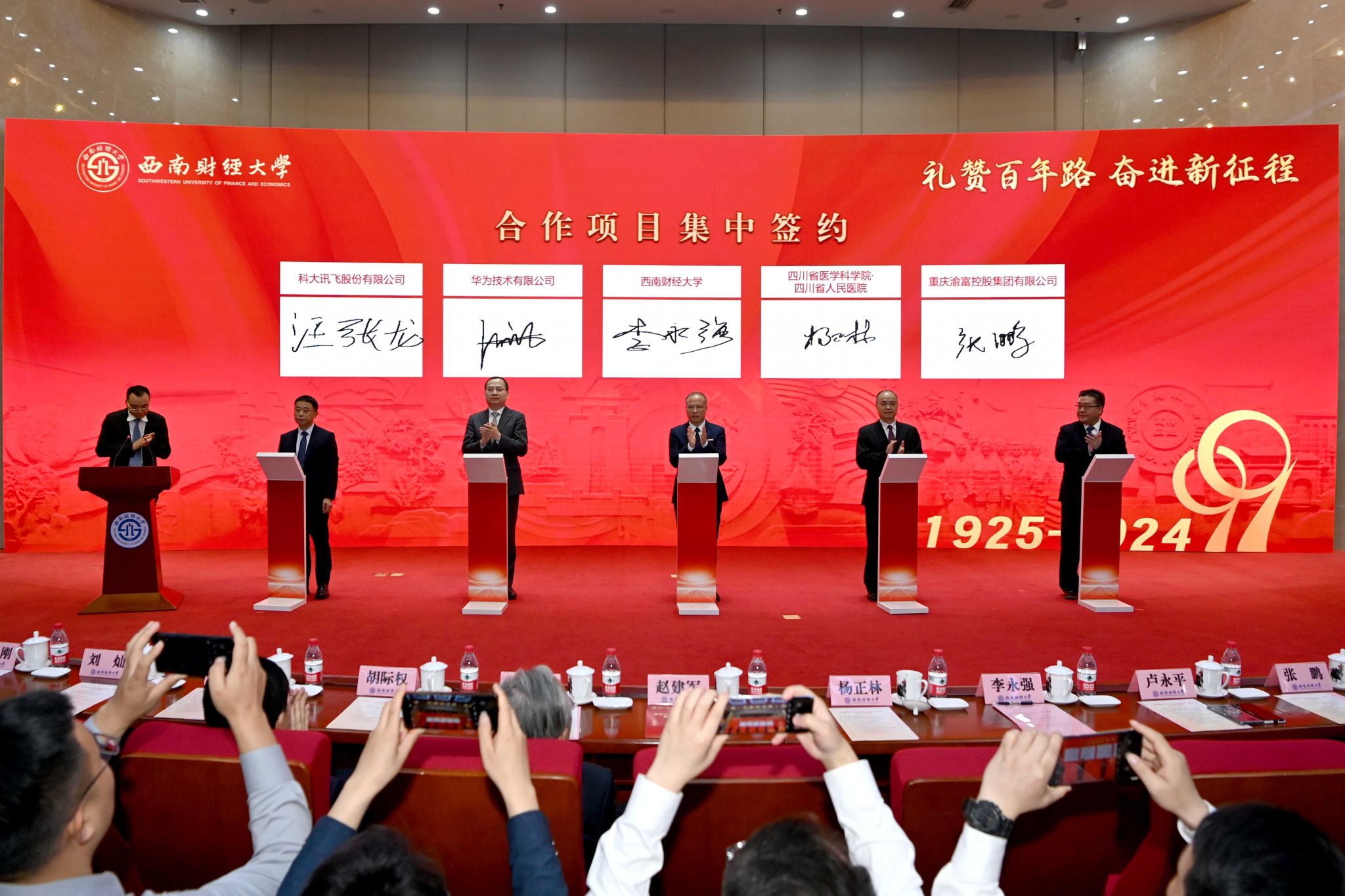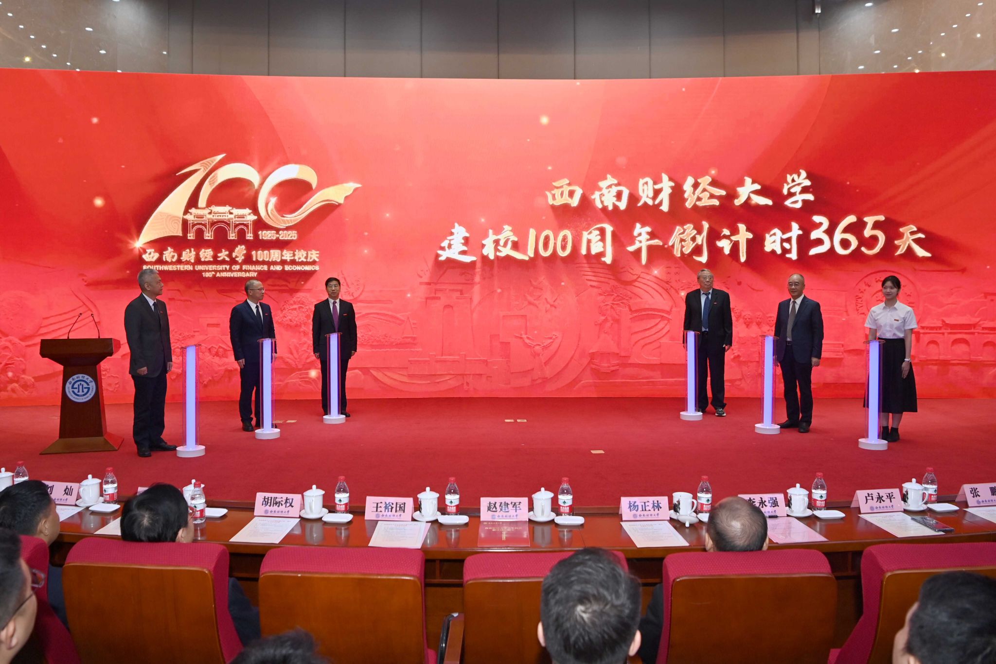 签约仪式后,王裕国、赵建军、李永强、曾永江、教师代表陈建东、学生代表王子慕共同启动西南财经大学建校100周年一周年倒计时。