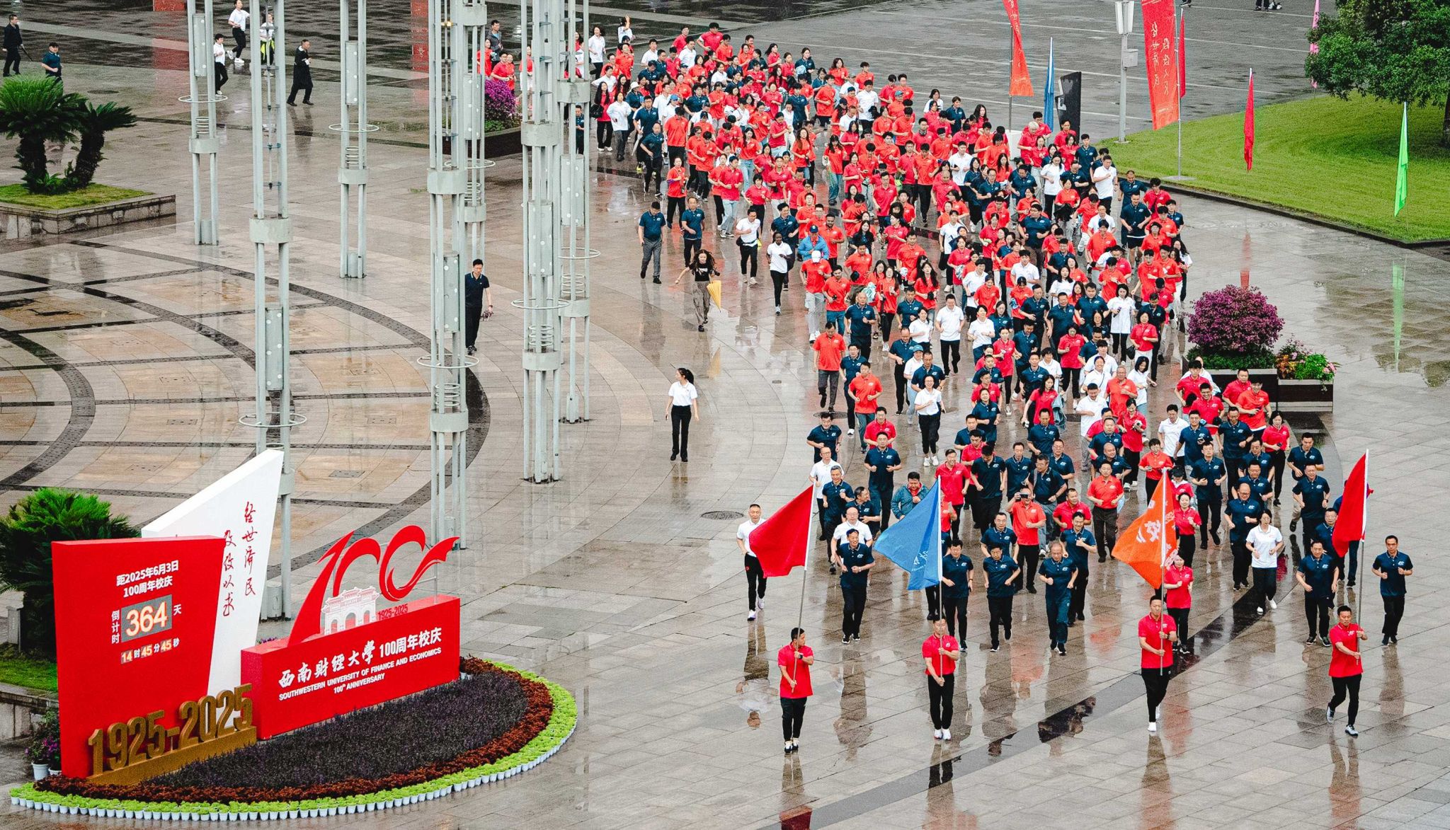 队伍环绕济民广场而行,《我和我的祖国》旋律悠扬,滚烫的爱国情怀浸透一词一句,在场师生校友思绪绵长,大家再次重温体悟学校百年来赓续红色血脉、矢志不渝教育报国的赤诚丹心。经世楼前,年轻的朋友们发出盛情邀约,欢快的鼓点萦绕在耳,如同催征号角,鞭策着全体西财人以更加饱满的姿态迎接百年佳期到来。道路两旁彩旗猎猎,师生们步履矫健,北大门广场歌舞欢腾,赴约百年华诞、共谋发展新篇的洋洋热情感染全场,激励大家怀揣“强国建设、西财担当”的壮志豪情迎向胜利的终点。