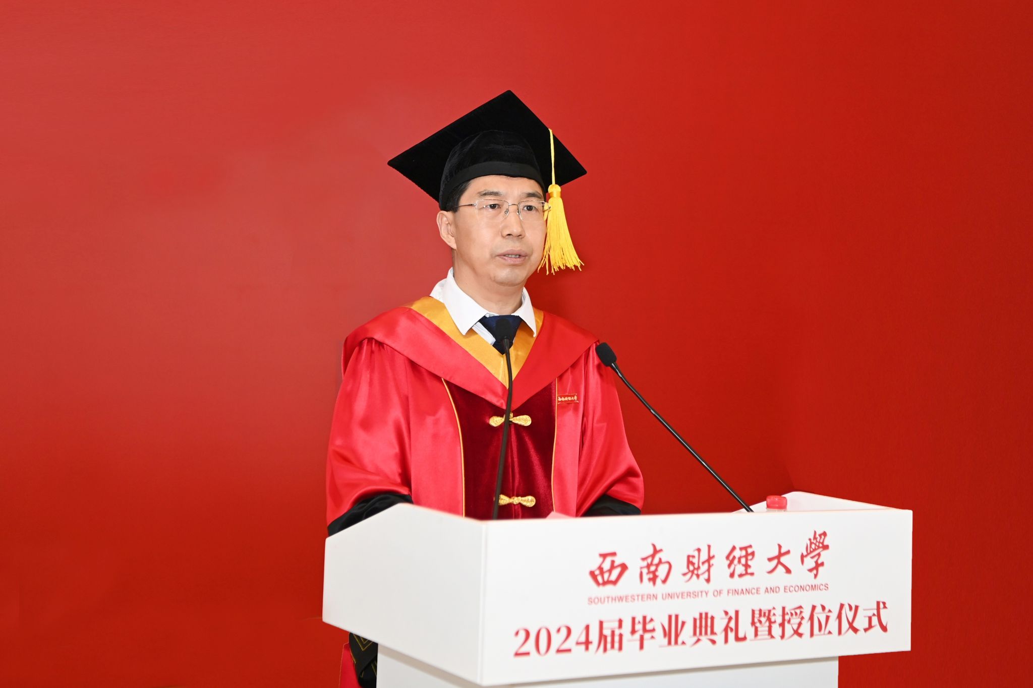 毕业生代表王怡焯发言,与在场师生共同回顾追梦奋斗的西财时光,表达对母校的热爱、对父母的感恩、对师友的不舍,表示将继续践行“经世济民、孜孜以求”西财精神,挺膺担当、砥砺奋斗,力争成为具有社会责任感、创新精神、国际视野的财经领域卓越人才,书写更加辉煌的青春篇章。
