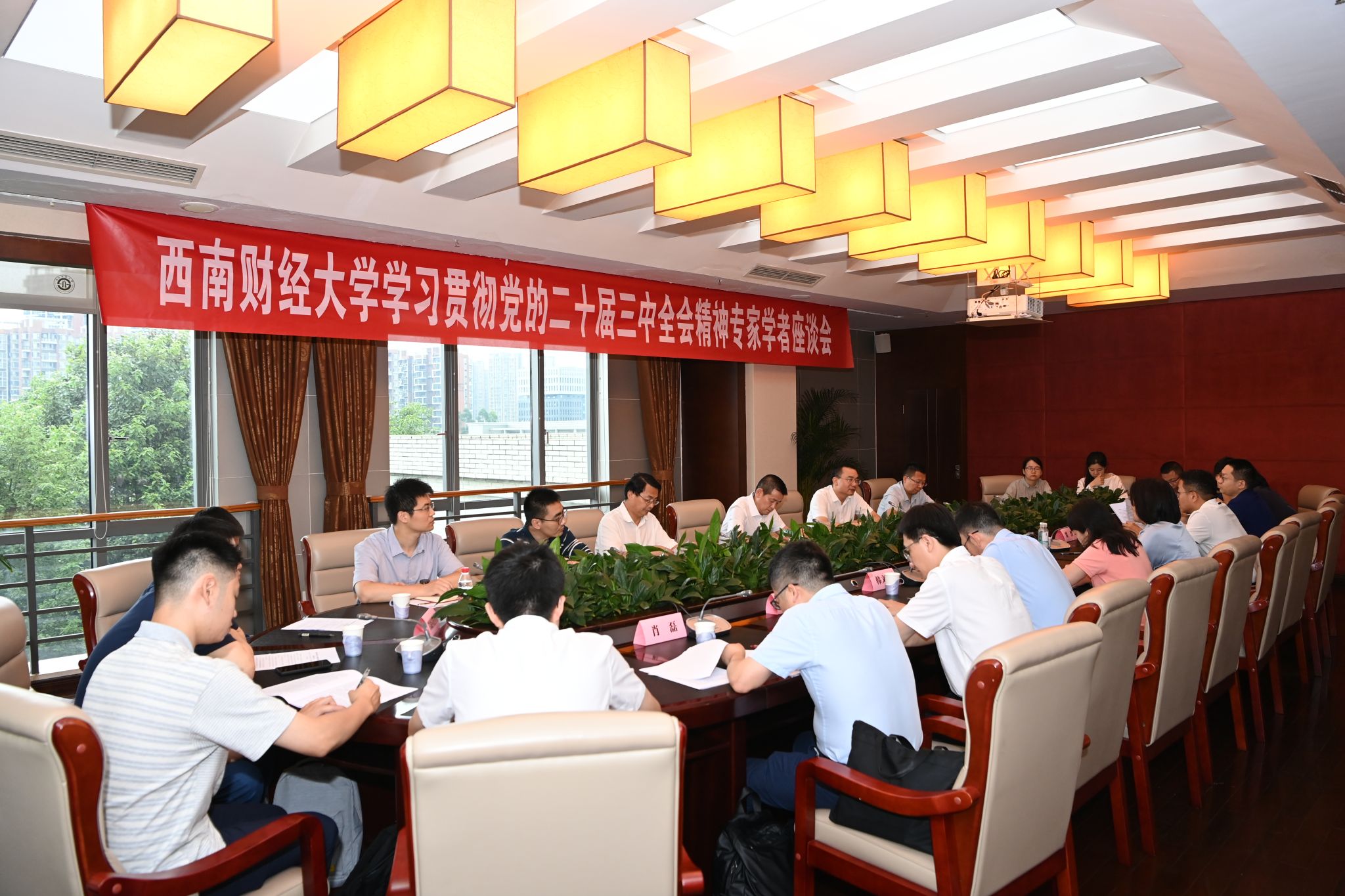 7月19日,学校在柳林校区腾骧楼604会议室召开学习贯彻党的二十届三中全会精神专家学者座谈会。党委副书记明海峰,党委常委、副校长马永强出席座谈会,来自学院(研究院)的专家学者、习近平经济思想研究院团队代表、省部级科研机构代表、《经济学家》及《财经科学》编辑、西财智库代表等30余人参加座谈。