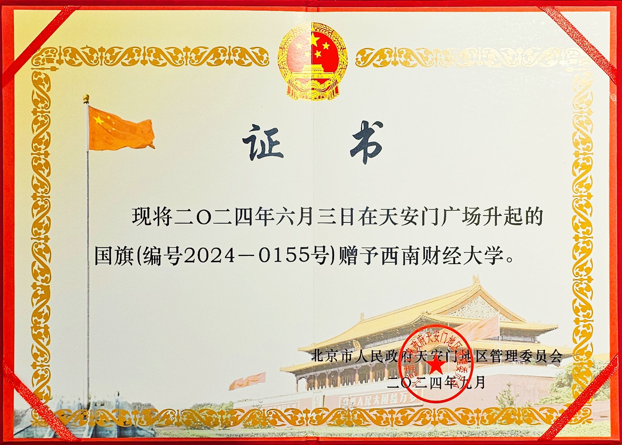 在天安门广场升挂过的国旗具有唯一性,十分珍贵。这面编号为2024-0155的国旗于2024年6月3日在天安门广场升起,正值西南财经大学建校99周年,对于学校意义非凡。天安门地区管理委员会将这面国旗赠予学校,是对学校即将迎来百年华诞的衷心祝贺、对学校近百年辉煌成就的赞誉肯定,更是对学校事业发展的巨大鼓舞和极大鞭策。