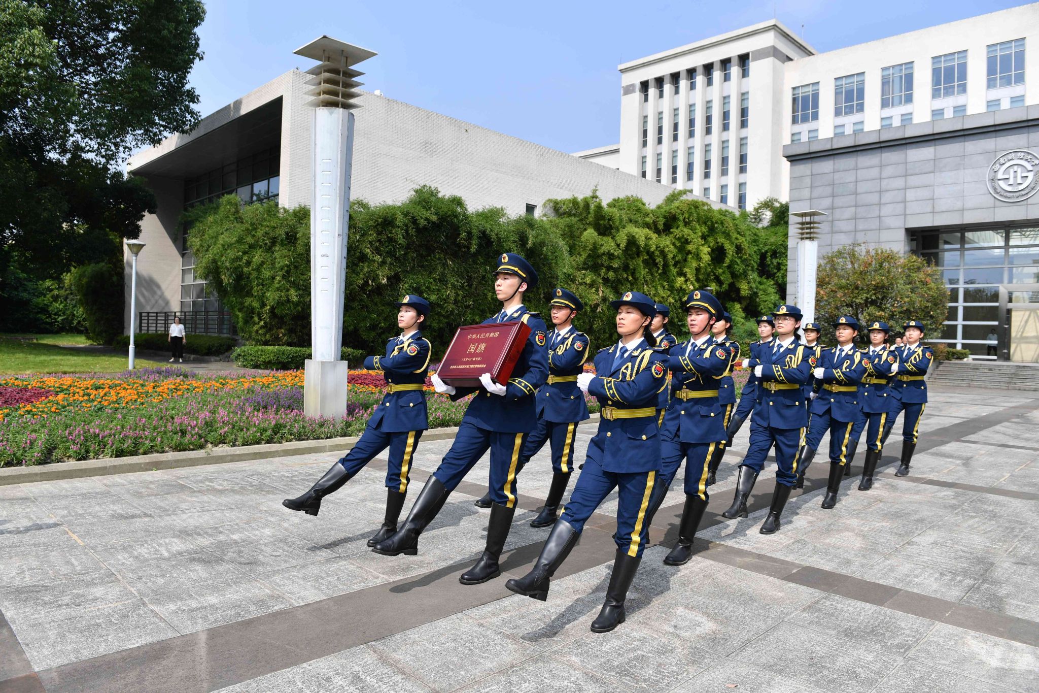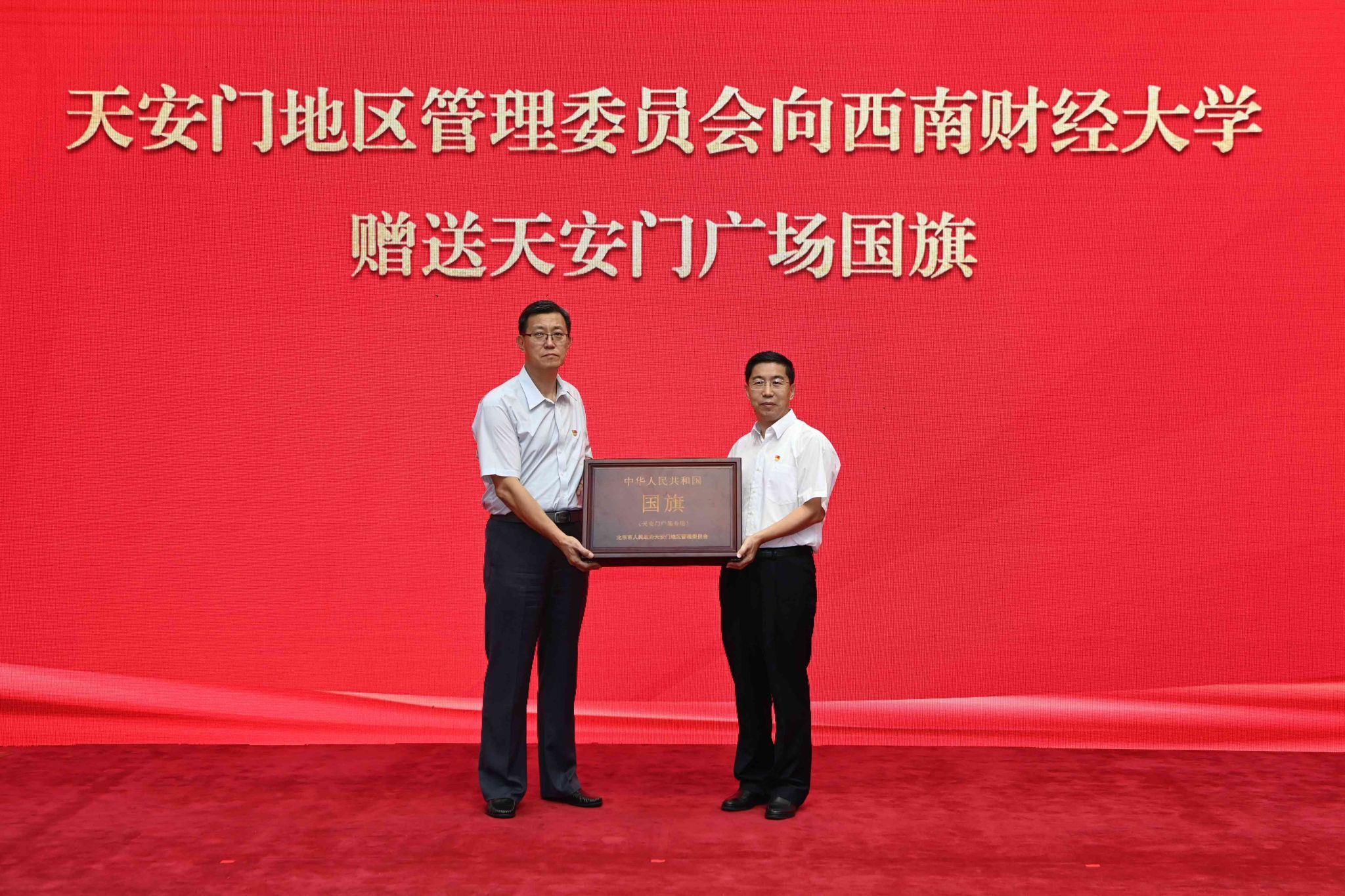 赵建军代表学校党委向天安门地区管理委员会表示热烈欢迎和诚挚感谢。他指出,每一面国旗都承载着无数先辈的奋斗与牺牲,凝聚着全体中国人民的爱国情怀和共同理想。这面国旗是西南财大的宝贵财富,是全校师生的共同荣誉,西财人倍感无上光荣、无尽荣耀,深感责任重大、使命重大。他强调,要在国旗指引下赓续红色基因、厚植爱国情怀,铸牢教育忠诚、勇担育人使命,凝聚奋进力量、谱写发展新篇,加快建设财经特色鲜明的世界一流大学,以实际行动和优异成绩献礼百年西财、服务强国建设。