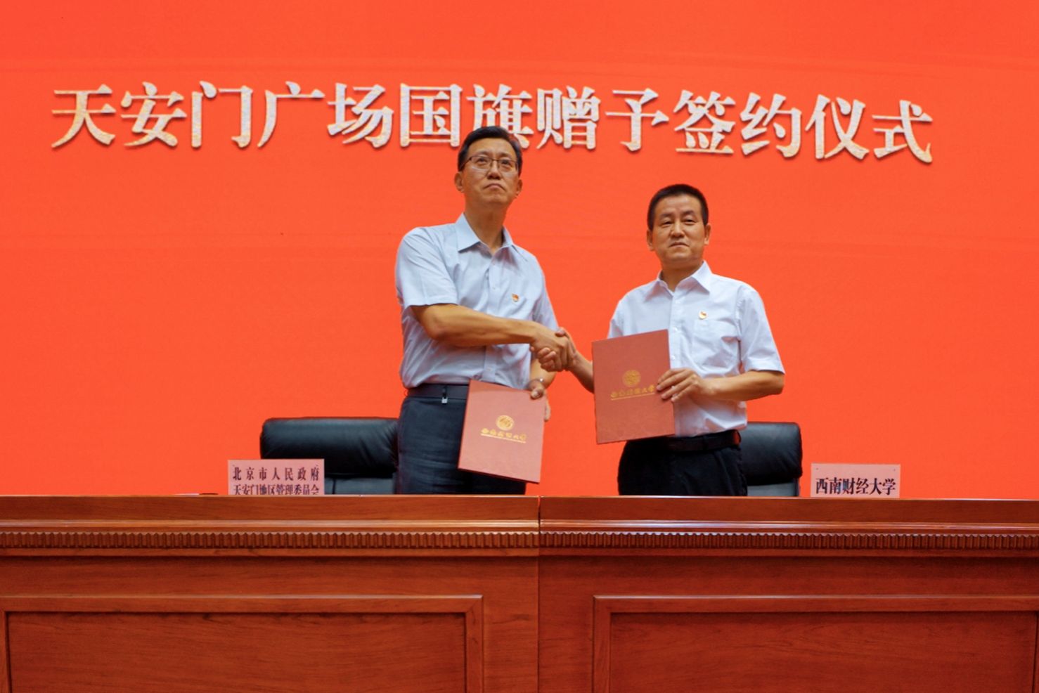 仪式上,姚辉、明海峰代表双方签署天安门广场国旗赠予协议,赵建军代表学校迎领国旗。鲜艳的五星红旗平整地叠放在刻有“中华人民共和国国旗”字样的檀木箱中,大五角星居中朝上,熠熠生辉。西南财经大学国旗班成员郑重接过檀木箱,庄严护旗并展示国旗,与会人员向国旗行注目礼。浓烈的爱国情报国志伴随着现场经久不息的掌声激荡心间。