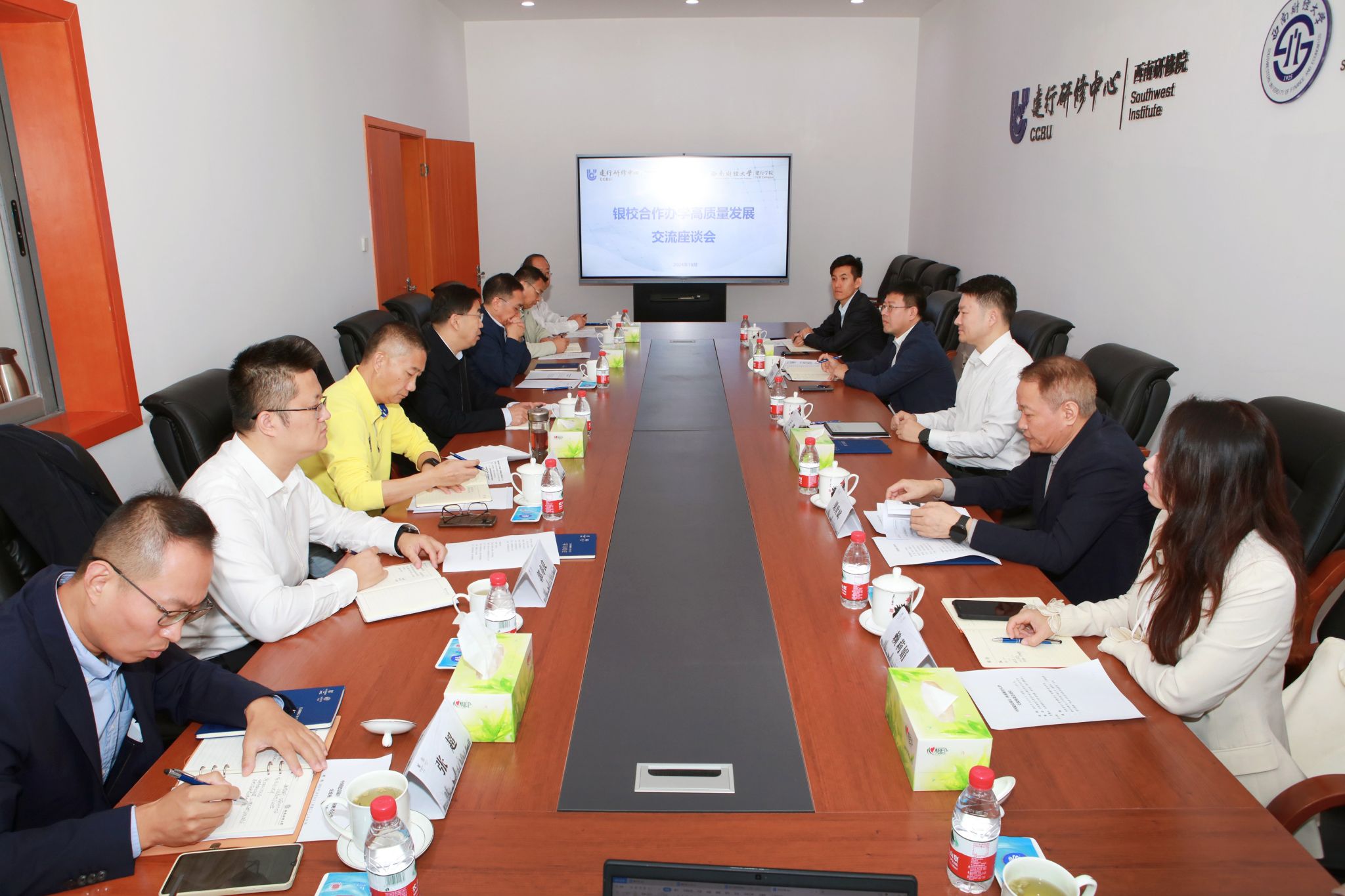 10月9日,学校党委书记赵建军在西南财经大学建行学院(建行研修中心西南研修院)召开座谈交流会,与建行研修中心(研究院)副主任(副院长)王锴一行探讨深入推进校银合作办学事宜,学校党委常委、副校长史代敏主持会议。